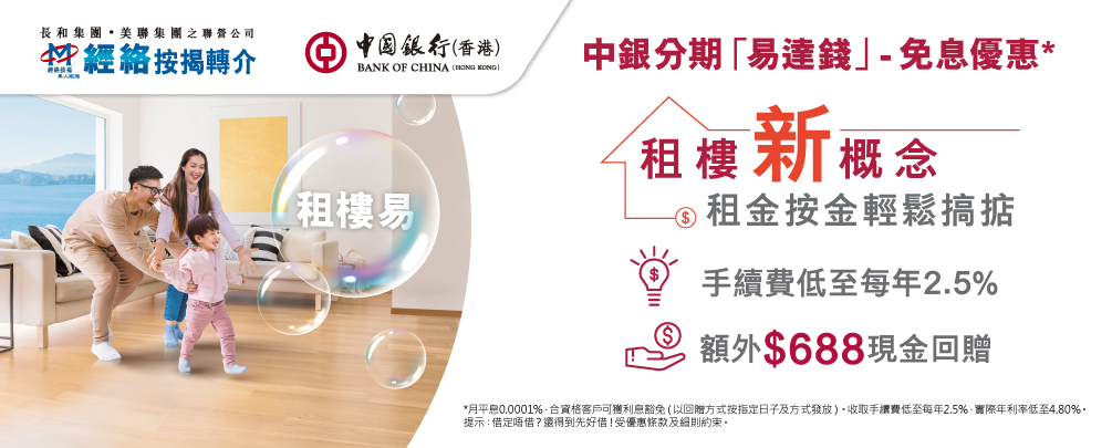 中银分期「易达钱」-免息优惠为中国银行(香港)(「中银香港」)之贷款产品,有关产品中银香港提供,与经络集团(香港)有限公司无关,经络按揭转介仅为中银香港宣传此产品资讯,如有任何查询,请致电中银分期「易达钱」+852 2108 3688与贷款专员联络。